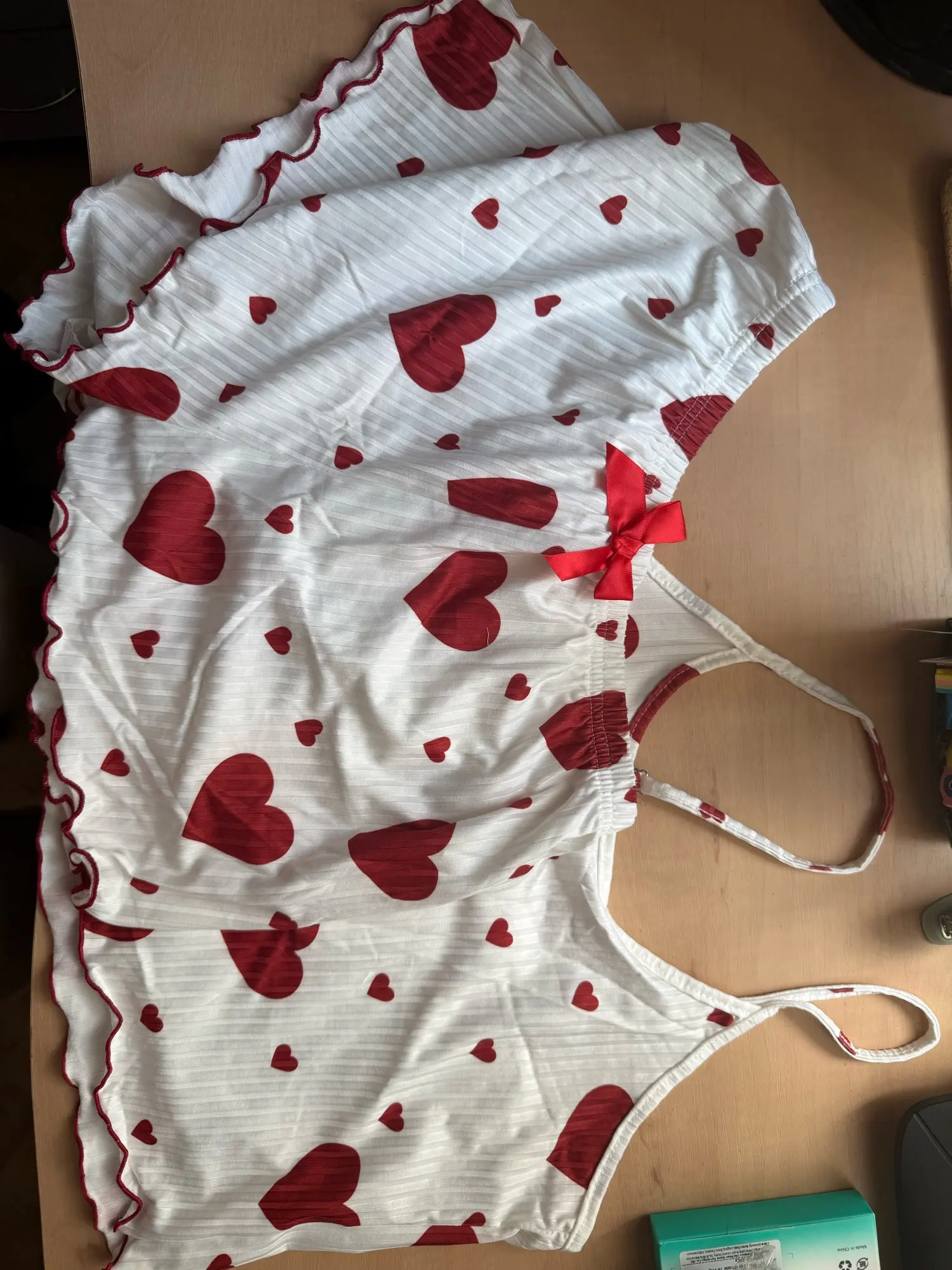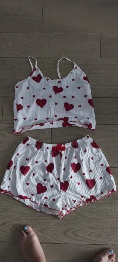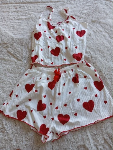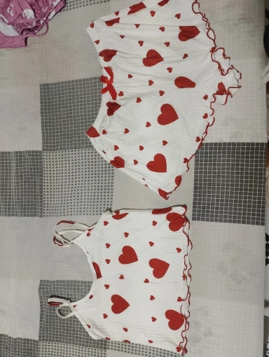 This dreamy two-piece set brings the perfect mix of flirty charm and lightweight comfort. With a heart-kissed print, playful frills, and a breathable fabric that moves with you, it’s everything your self-care routine deserves.